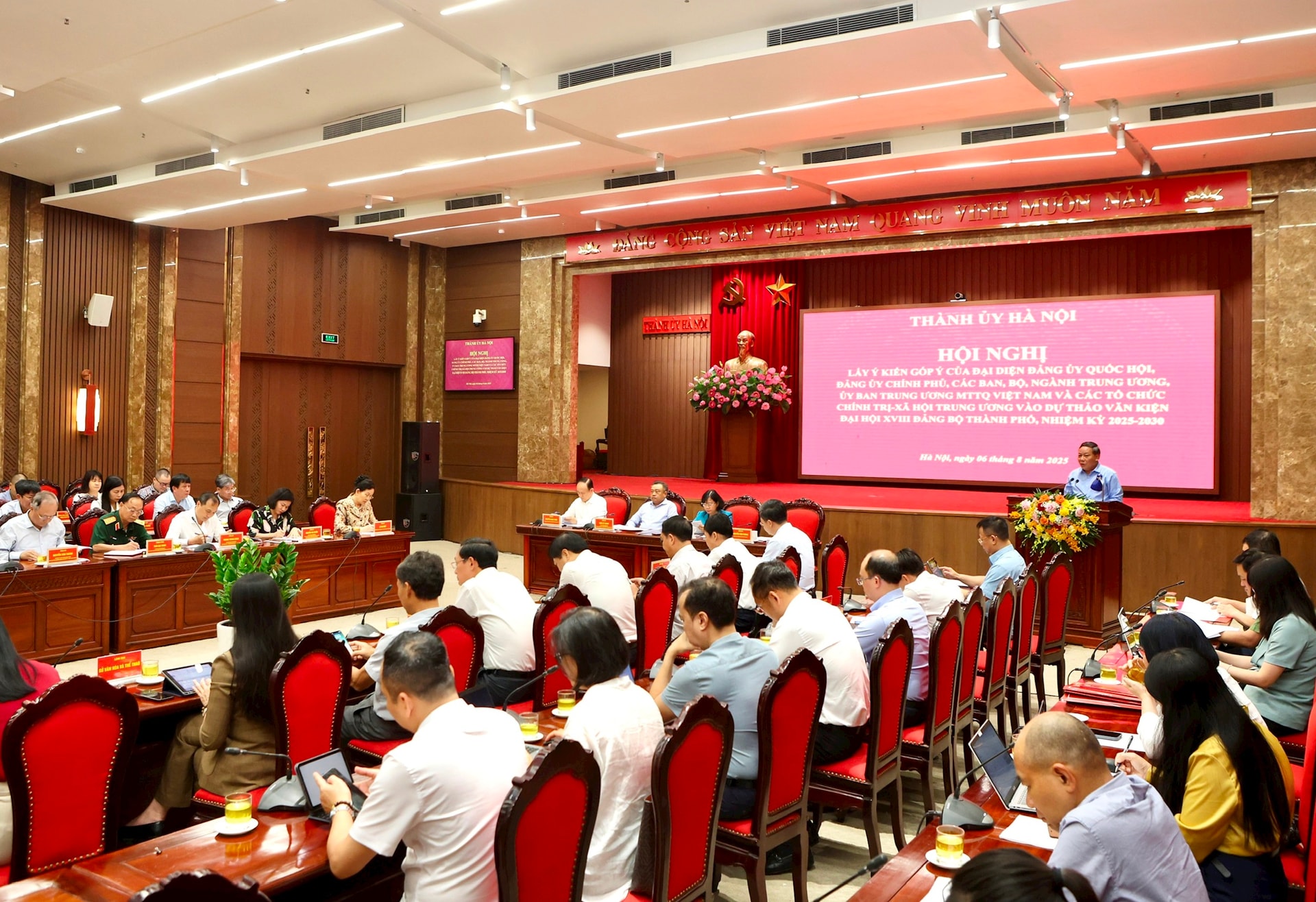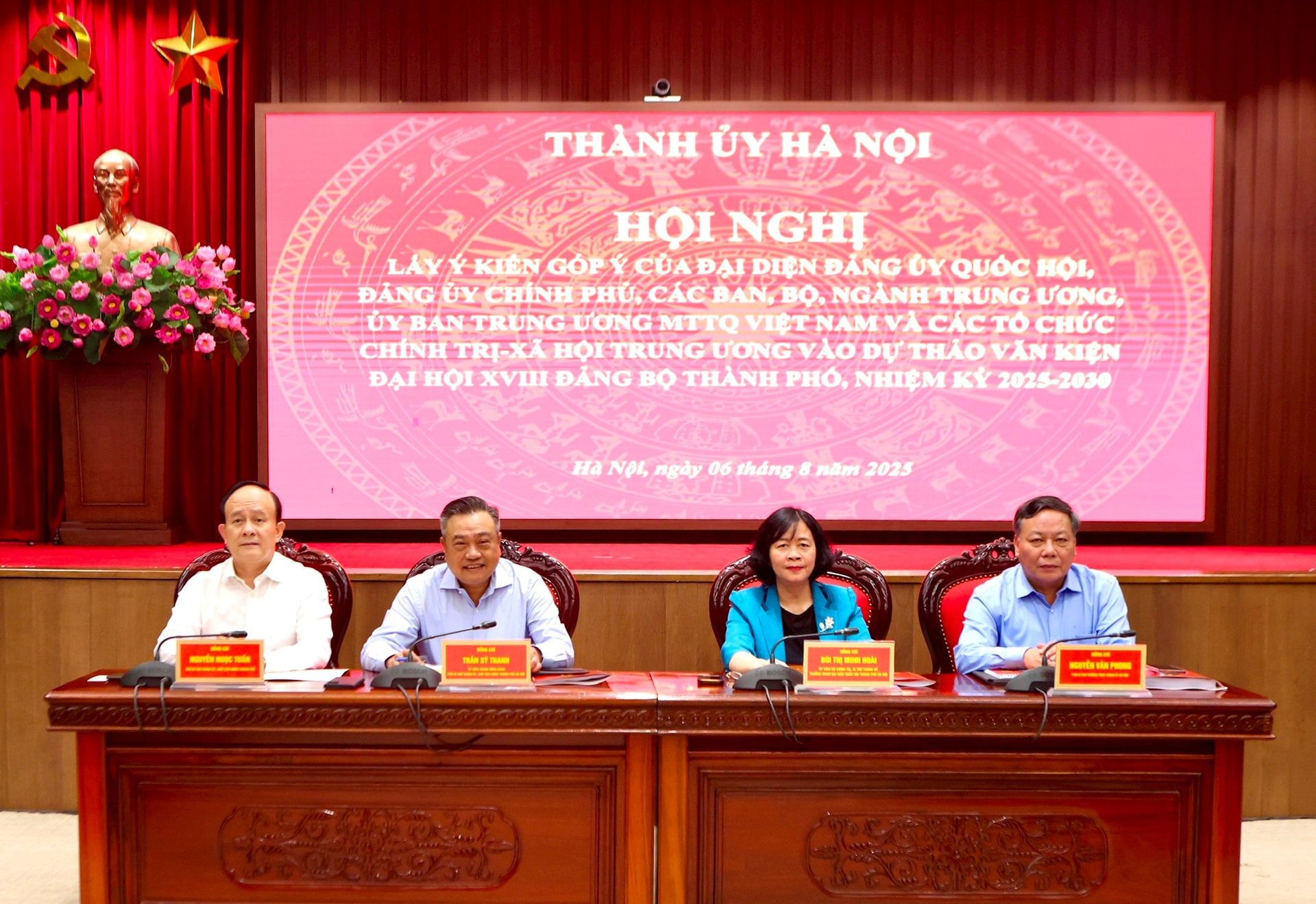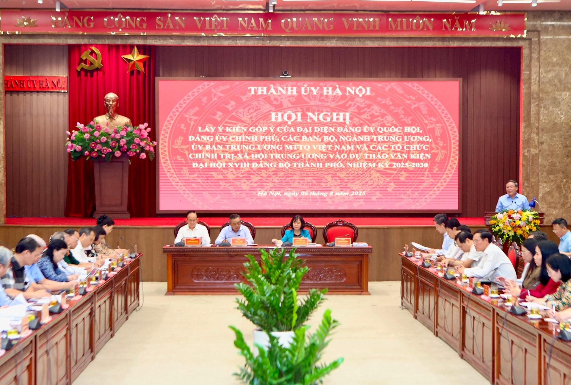 Chiều 06/8/2025, tại trụ sở Thành ủy Hà Nội, Ban Thường vụ Thành ủy tổ chức hội nghị lấy ý kiến góp ý của đại diện Đảng ủy Quốc hội, Đảng ủy Chính phủ, các ban, bộ, ngành, Ủy ban Trung ương Mặt trận Tổ quốc Việt Nam và các tổ chức chính trị - xã hội Trung ương vào Dự thảo văn kiện Đại hội XVIII Đảng bộ thành phố Hà Nội, nhiệm kỳ 2025-2030.