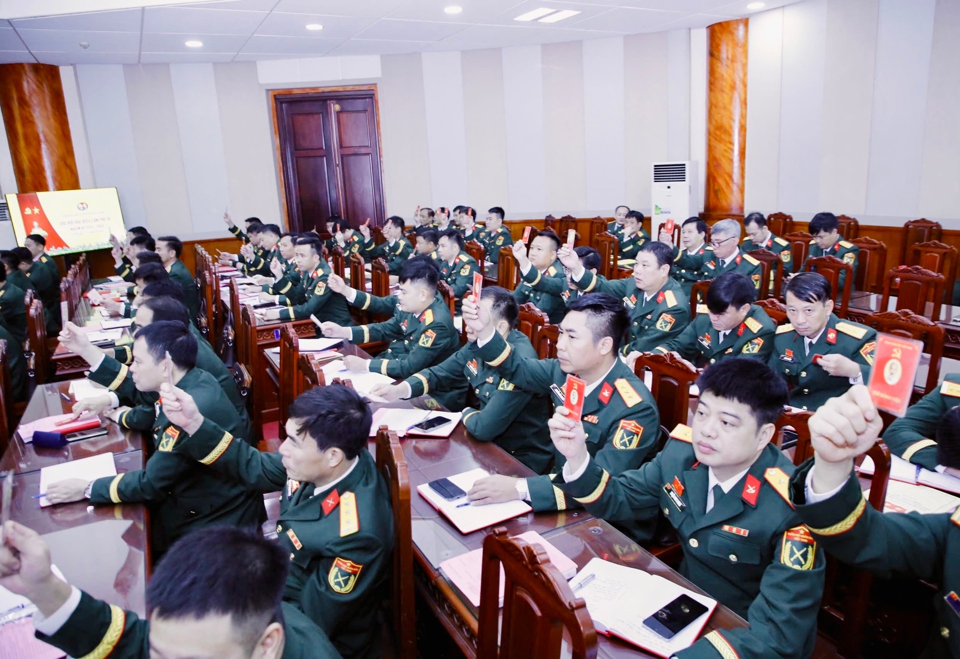 Bí thư Thành ủy Bùi Thị Minh Hoài, Bí thư Đảng ủy Bộ Tư lệnh Thủ đô và các đại biểu bỏ phiếu bầu Ban Chấp hành Đảng bộ Bộ Tư lệnh Thủ đô Hà Nội khóa IV. Ảnh: Viết Thành