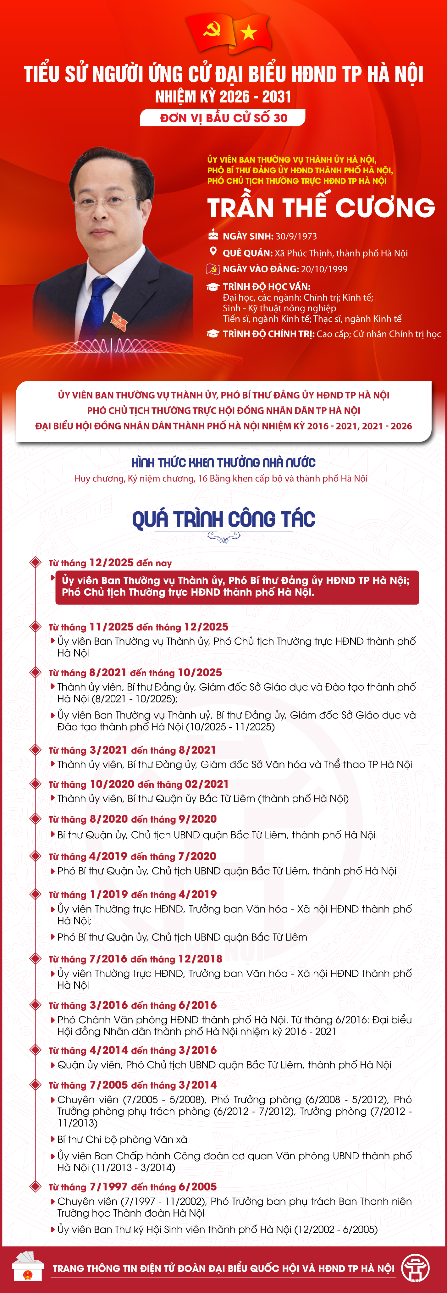 Đồng chí Trần Thế Cương, Ủy viên Ban Thường vụ Thành ủy Hà Nội, Phó Bí thư Đảng ủy HĐND Thành phố, Phó Chủ tịch Thường trực HĐND Thành phố ứng cử Đại biểu HĐND khóa XVII nhiệm kỳ 2026 - 2031 tại Đơn vị bầu cử số 30 (gồm các xã: Mê Linh, Yên Lãng, Tiến Thắng, Quang Minh) thành phố Hà Nội.