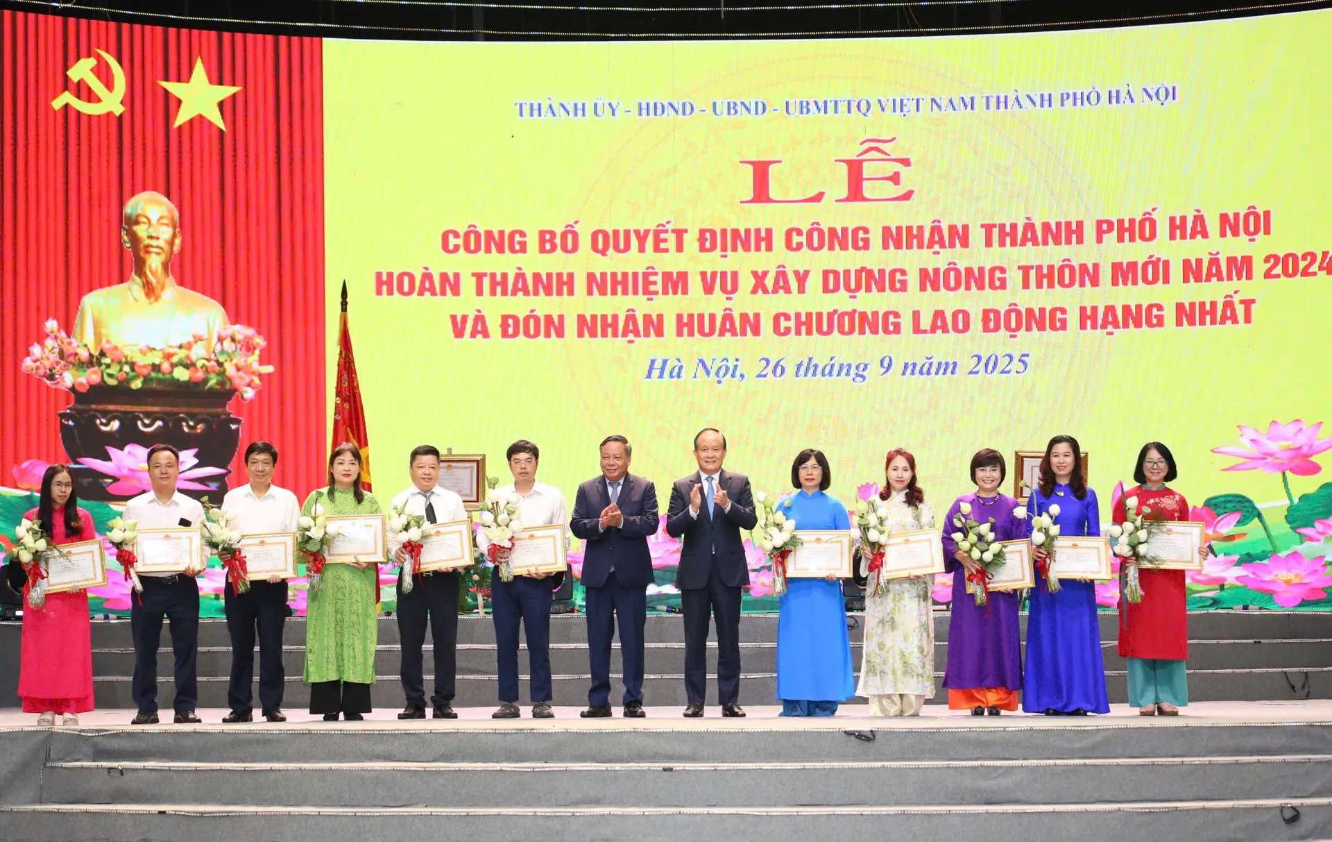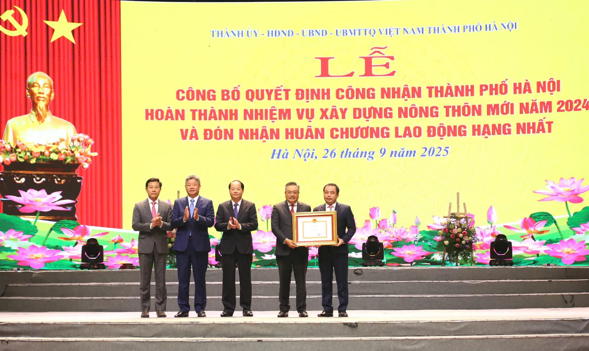 Ngày 26/9/2025, Thành ủy, HĐND - UBND - Ủy ban MTTQ Việt Nam thành phố Hà Nội tổ chức Lễ Công bố Quyết định công nhận thành phố Hà Nội hoàn thành nhiệm vụ xây dựng nông thôn mới năm 2024 và đón nhận Huân chương Lao động hạng Nhất.