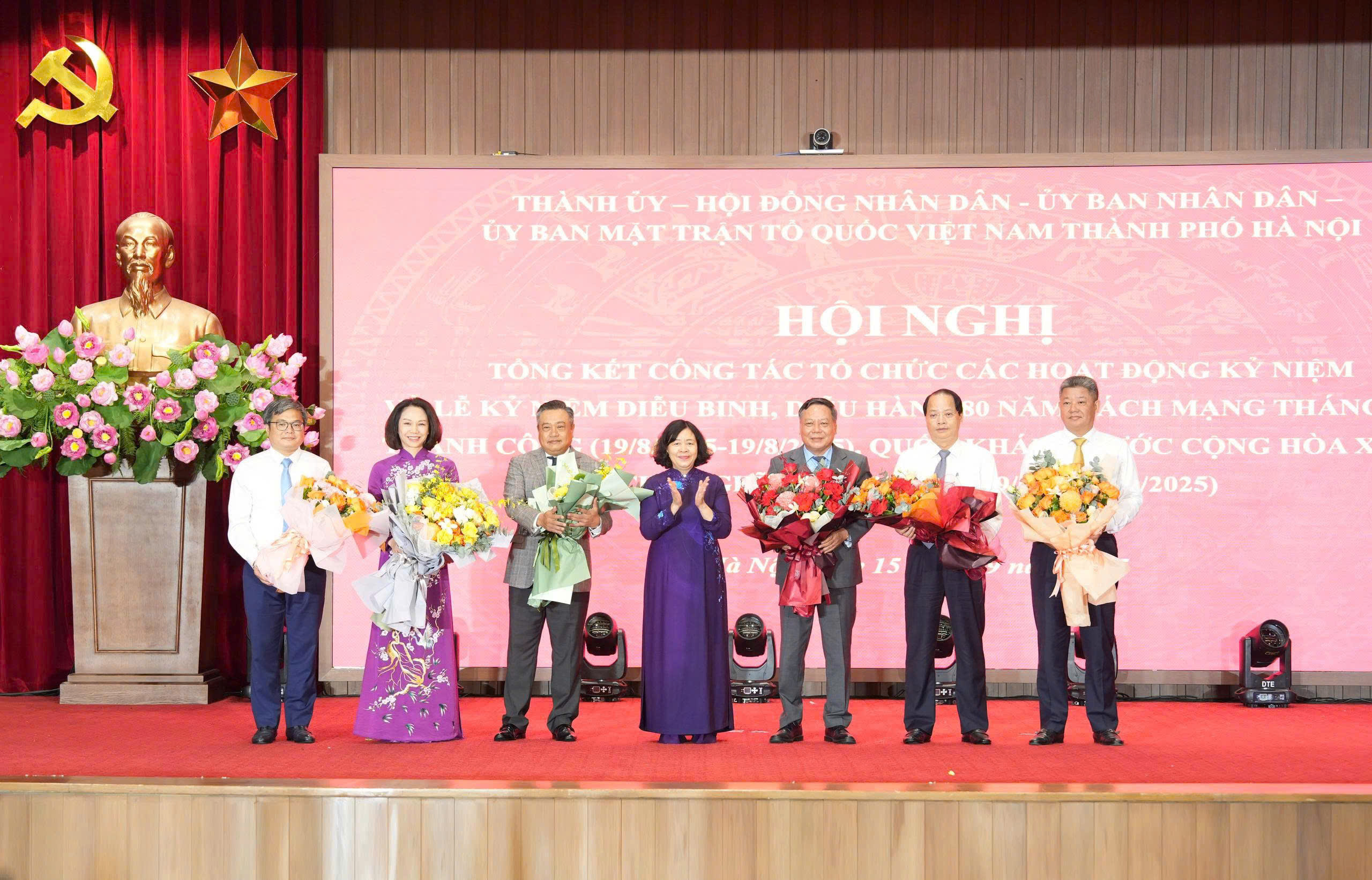 Tại hội nghị, Ủy viên Bộ Chính trị, Bí thư Thành ủy Hà Nội Bùi Thị Minh Hoài tặng hoa các đồng chí Ban Tổ chức và các Trưởng Tiểu ban để chúc mừng thành công sự kiện lễ kỷ niệm A80.