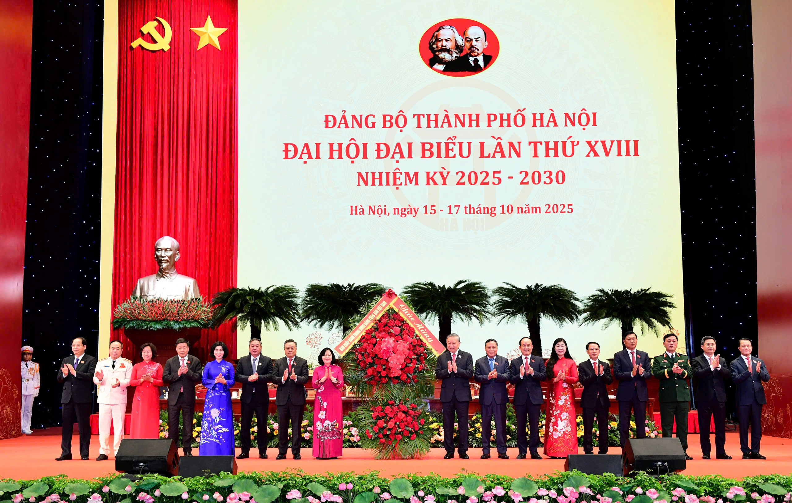 Nhân dịp này, thay mặt Ban Chấp hành Trung ương Đảng, Tổng Bí thư Tô Lâm đã trao tặng lẵng hoa chúc mừng Đại hội đại biểu Đảng bộ thành phố Hà Nội lần thứ XVIII.