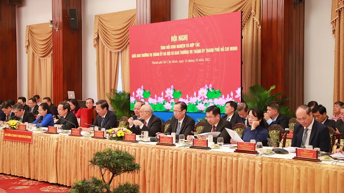 Chiều 18/10/2023, tại Hội trường Thống Nhất, thành phố Hồ Chí Minh đã diễn ra Hội nghị làm việc, trao đổi kinh nghiệm và hợp tác giữa Ban Thường vụ Thành ủy Hà Nội và Ban Thường vụ Thành ủy Thành phố Hồ Chí Minh.