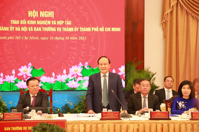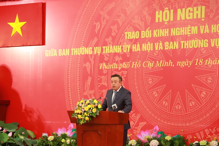 Phát biểu tổng kết Hội nghị, Ủy viên Bộ Chính trị, Bí thư Thành ủy Hà Nội Đinh Tiến Dũng chúc mừng những thành tựu mà Đảng bộ, chính quyền, quân và dân thành phố Hồ Chí Minh đã đạt được; thông tin về những kết quả cơ bản mà Đảng bộ, chính quyền, quân và dân thành phố Hà Nội đã đạt được thời gian qua. Đồng chí khẳng định những kết quả đạt được của hai thành phố đã đóng góp quan trọng trong việc thực hiện thắng lợi các chỉ tiêu, nhiệm vụ phát triển kinh tế-xã hội, an ninh-quốc phòng, đối ngoại, công tác xây dựng Đảng và hệ thống chính trị của cả nước.