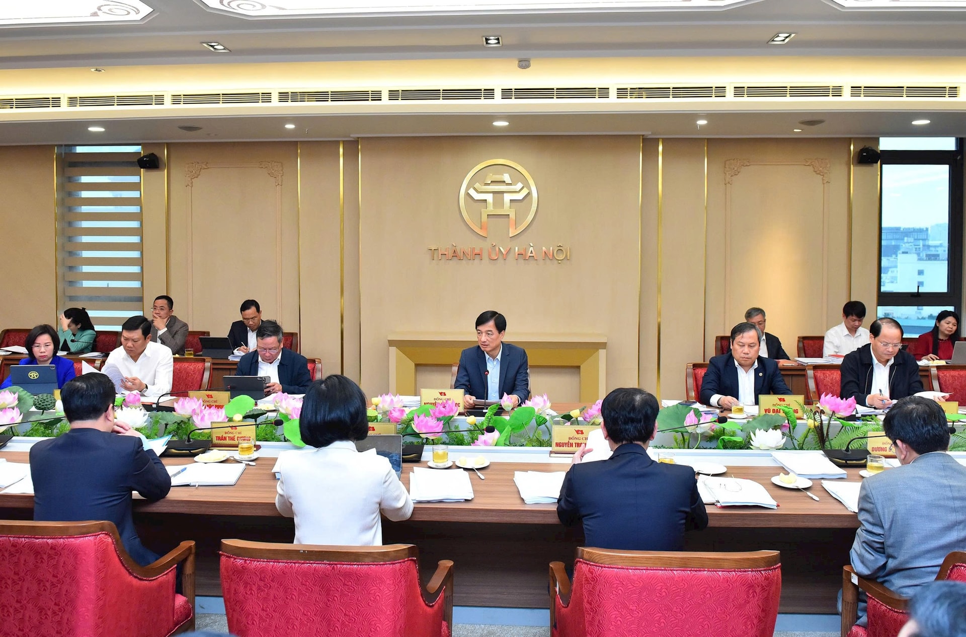 Chủ trì cuộc họp có các đồng chí: Ủy viên Bộ Chính trị, Bí thư Thành ủy Hà Nội Nguyễn Duy Ngọc; Ủy viên Trung ương Đảng, Phó Bí thư Thành ủy, Chủ tịch UBND thành phố Hà Nội Vũ Đại Thắng; Ủy viên Trung ương Đảng, Phó Bí thư Thường trực Thành ủy Hà Nội Nguyễn Trọng Đông; Phó Bí thư Thành ủy, Chủ tịch HĐND thành phố Hà Nội Phùng Thị Hồng Hà; Phó Bí thư Thành ủy Hà Nội Nguyễn Văn Phong.