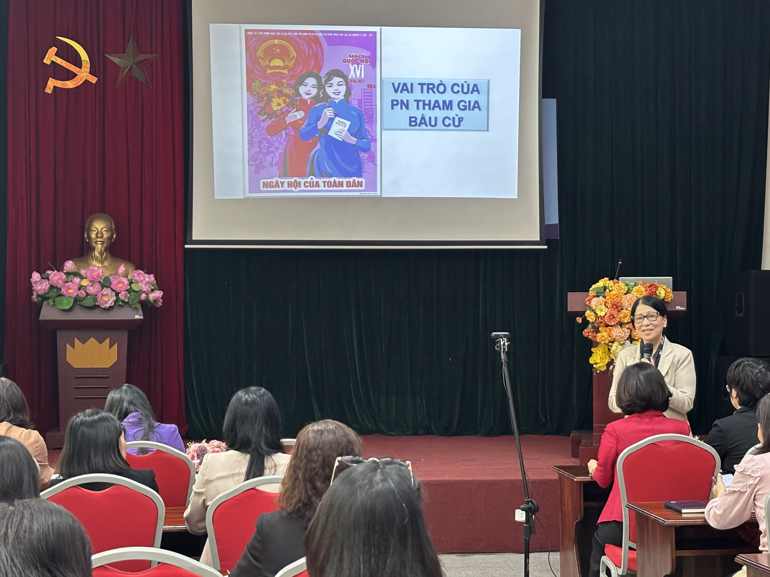 "Phụ nữ cần chủ động tham gia bầu cử, bầu đúng, bầu đủ cho đại biểu xứng đáng, đại diện cho tiếng nói của phụ nữ. Đặc biệt, cán bộ Hội cần phát huy vai trò người truyền cảm hứng bằng những hành động gương mẫu như đi bầu sớm và lan tỏa tinh thần trách nhiệm trong gia đình" - báo cáo viên nhấn mạnh.